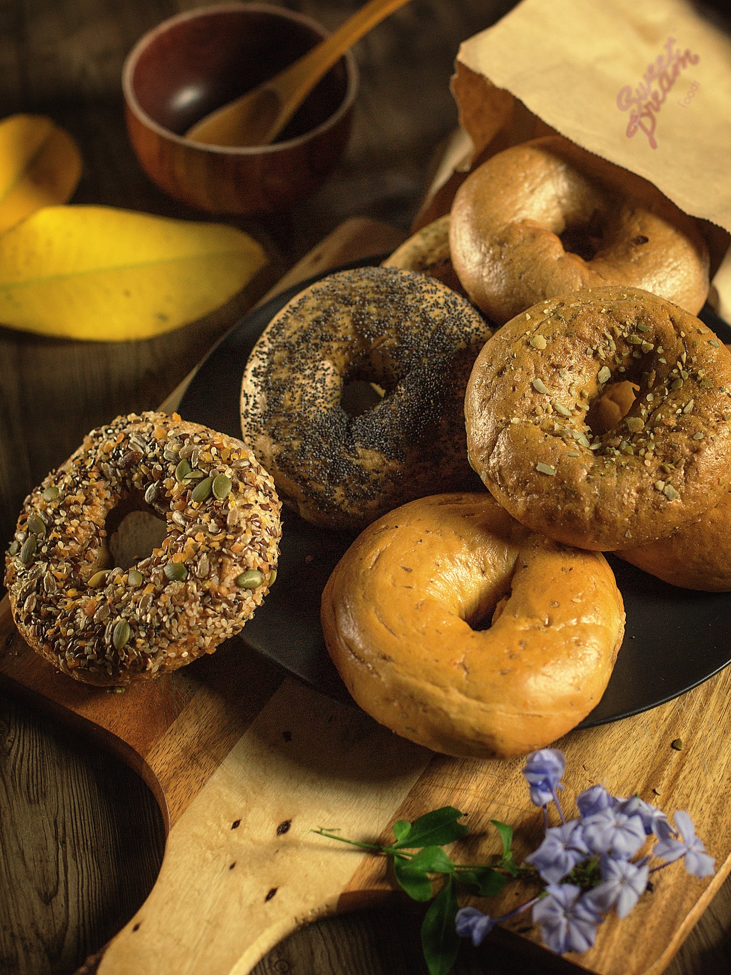 All our bagels are traditionally hand-rolled and boiled. We offer multiple infused flavour bagels. Many are unique to Sweet Dream Foods. We follow the Montreal-style bagel process, which is a denser bagel. We use very little salt as a rising agent, so our bagels are a low source of sodium.